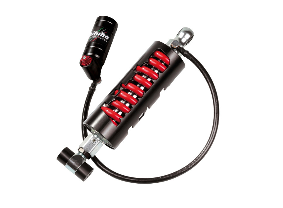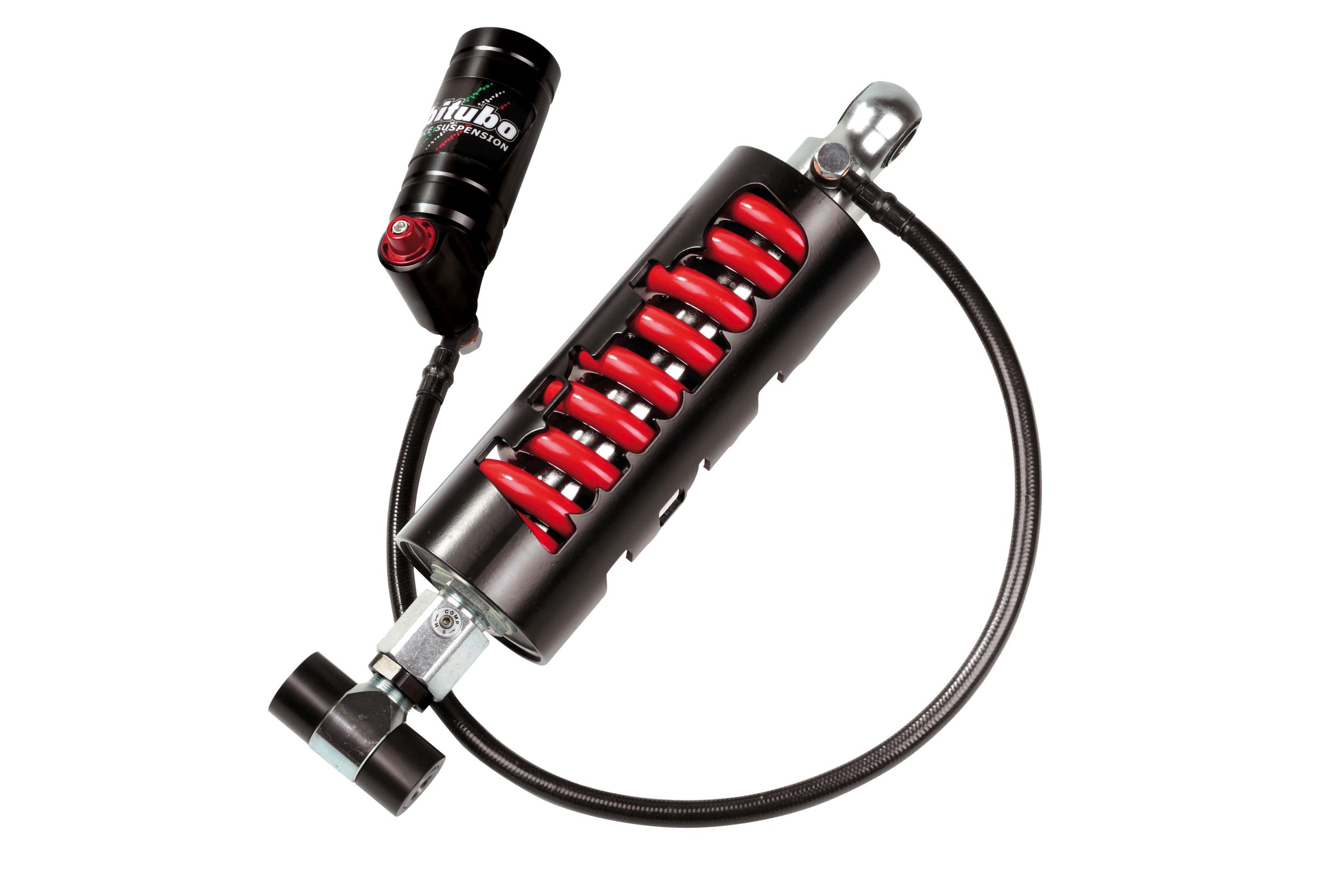 Single-chamber shock absorber, steel shock absorber body, Ø14mm steel stem; gas pressurized via separate compensation chamber connected with a flexible tube for very high pressures; linear stiffness spring; external bell made with a cage structure.
