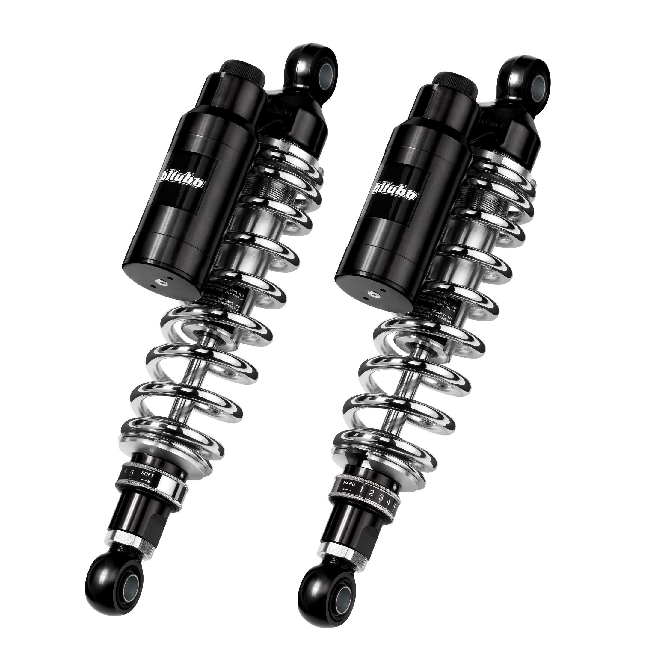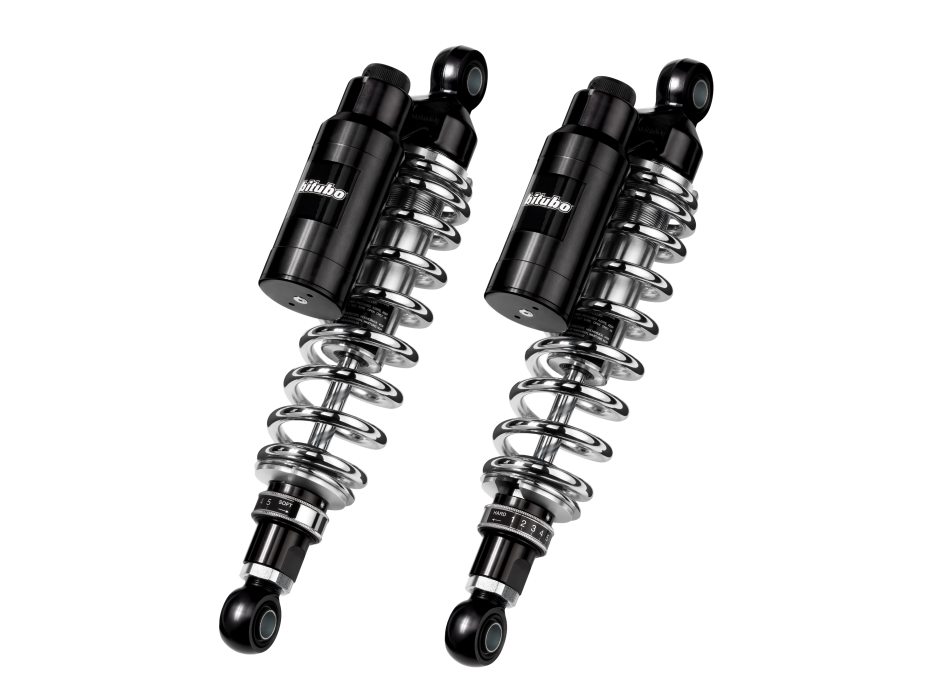 Shock absorber body in high-strength alloy steel, Ø12mm steel stem, separate compensation chamber in aluminium, gas pressurised (Nitrogen), heads in aluminium alloy machined from solid with CNC machining.